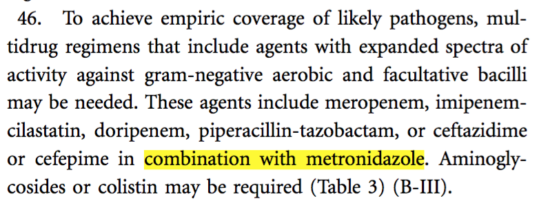 However, in Table 3 of the guidelines it is clear that metronidazole is only to be combined with ceftazidime or cefepime, and not with carbapenems or piperacillin-tazobactam.