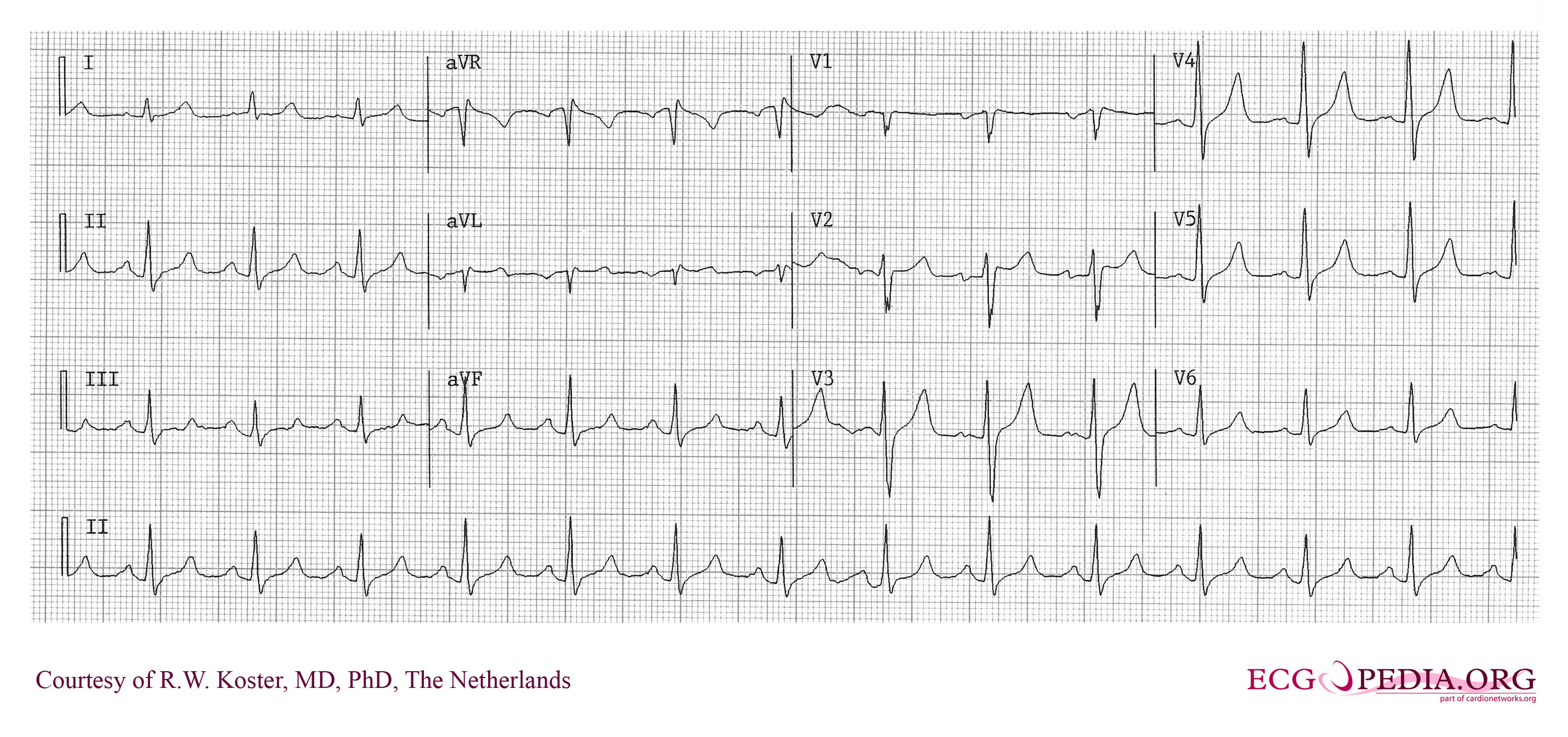 An ECG from the same patient after correction of the serum potassium has begun. Note the T waves remain peaked but the P waves and QRS interval have normalized: