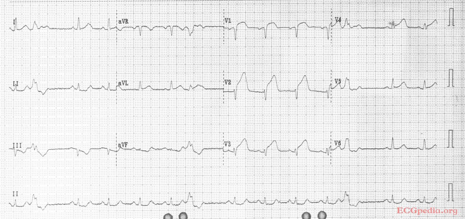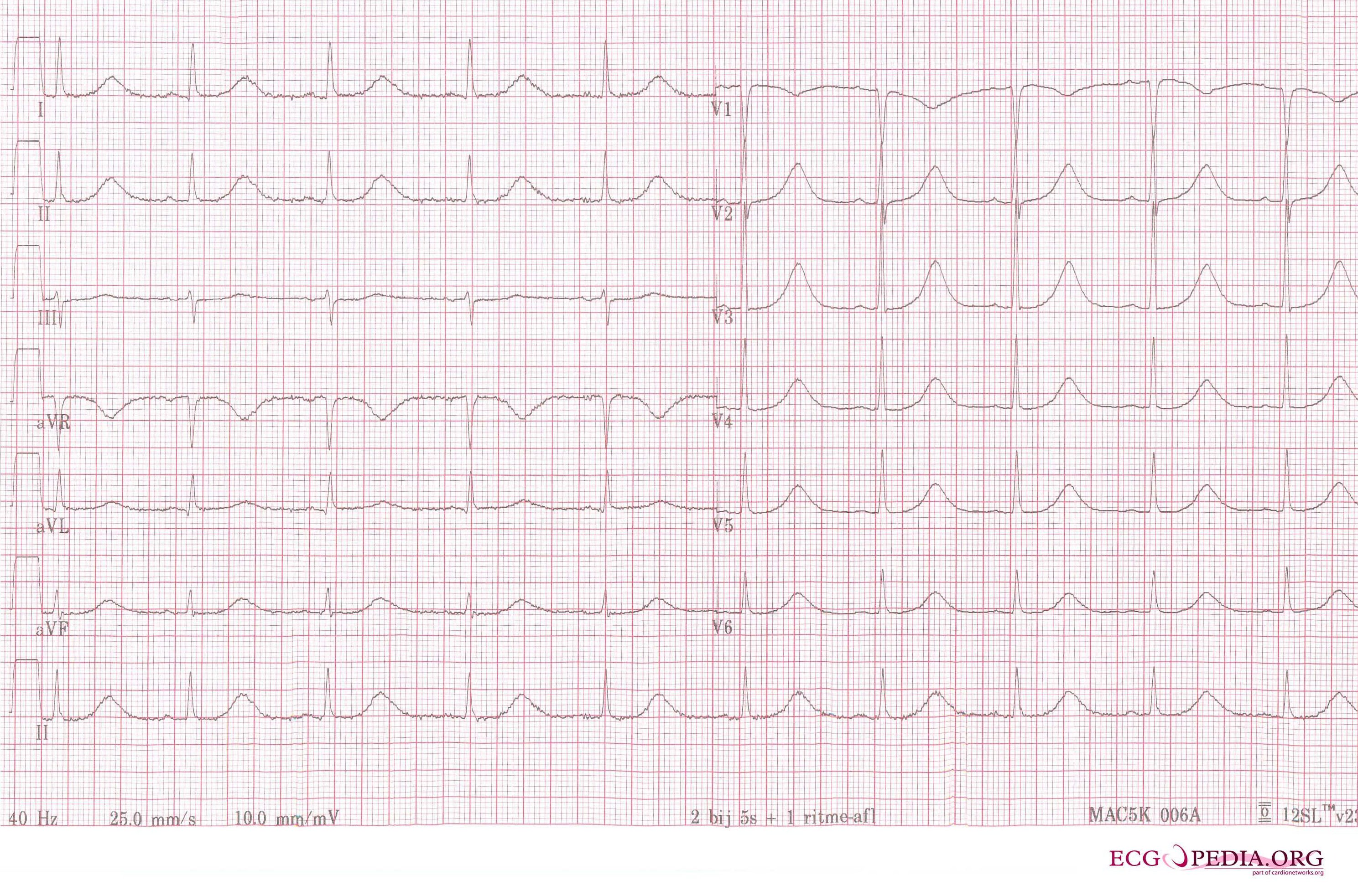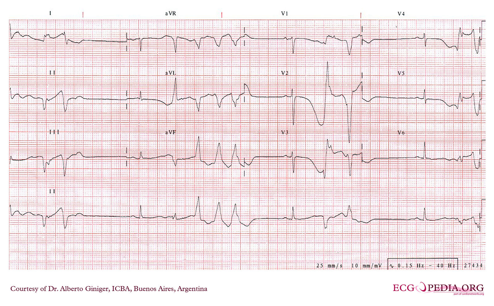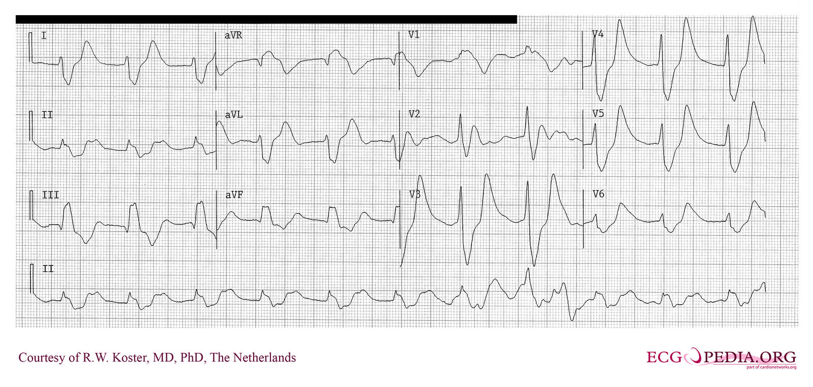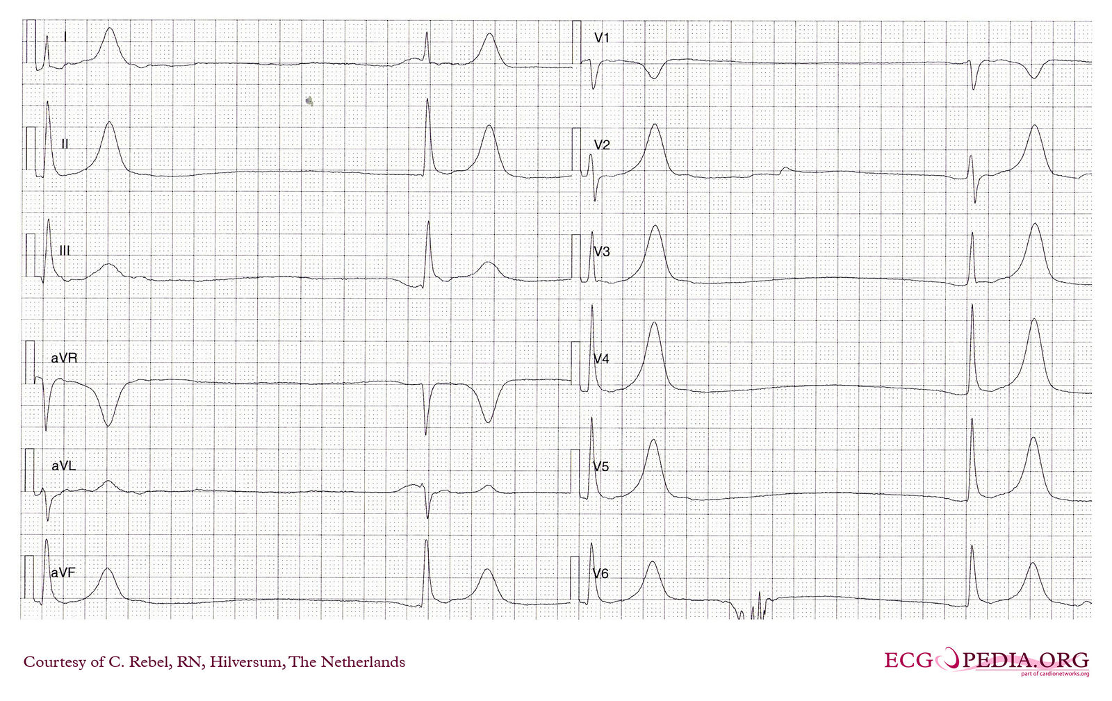 The example below is of sotalol toxicity. There is a prolonged QTc and a premature ventricular beat.