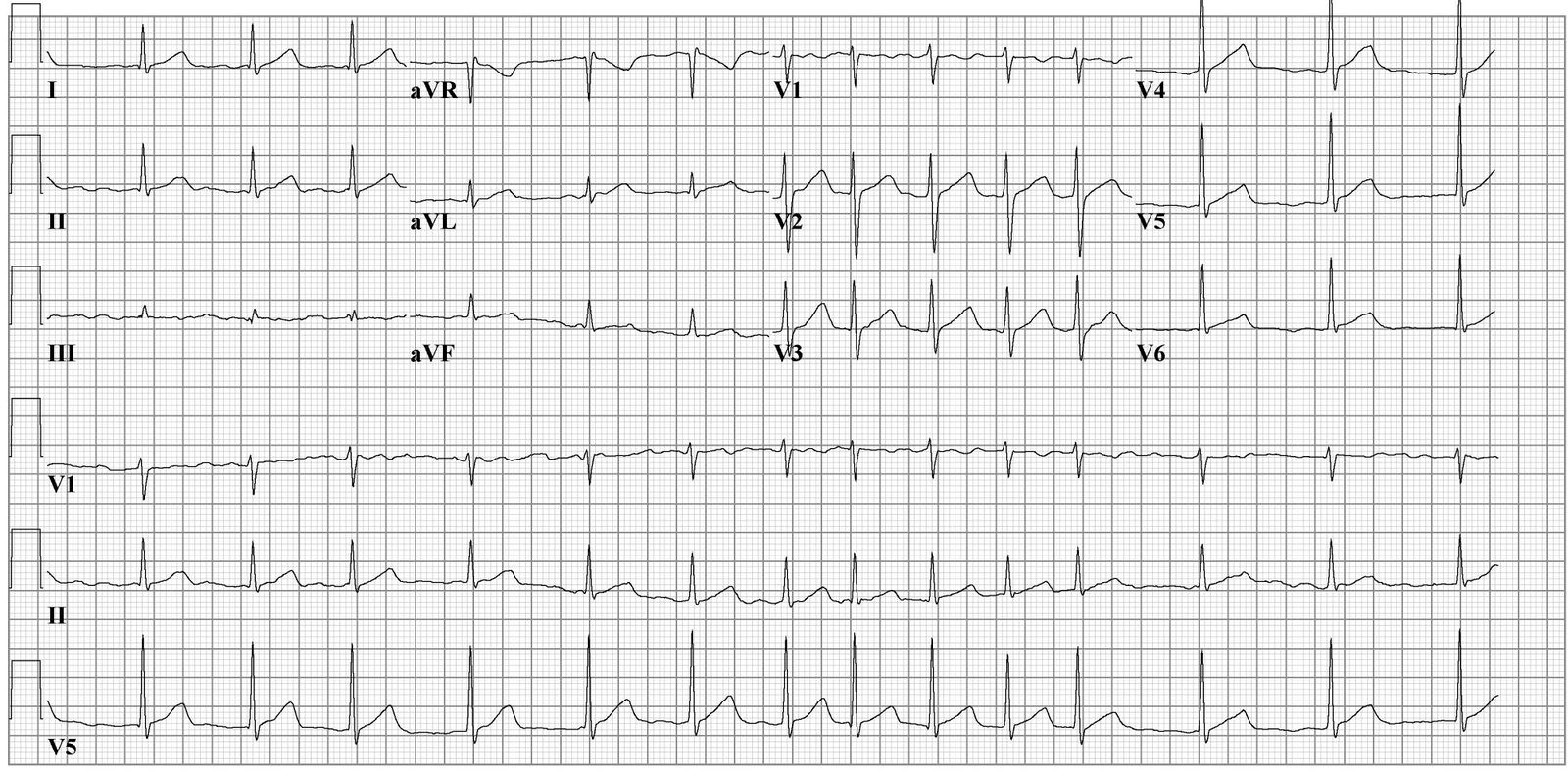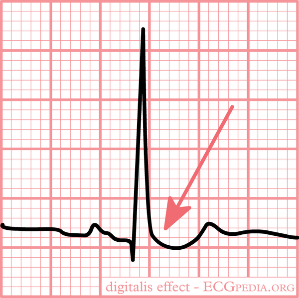 Digoxin causes a funny “scooped” looking ST depression which you can see in the image below. This does not indicate toxicity – just that the patient is taking digoxin.