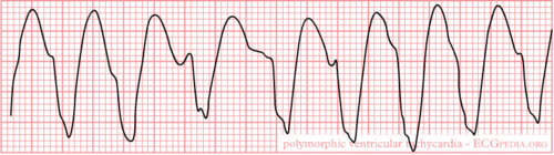 During Torsades de Pointes the ventricles depolarize in a circular fashion resulting in QRS complexes with a continuously turning heart axis around the baseline (hence the name Torsades de Pointes).