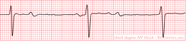 Look for no temporal relationship between the P waves and the R waves. The atria and the ventricles are not in sync due to the complete block of electrical activity between them.
