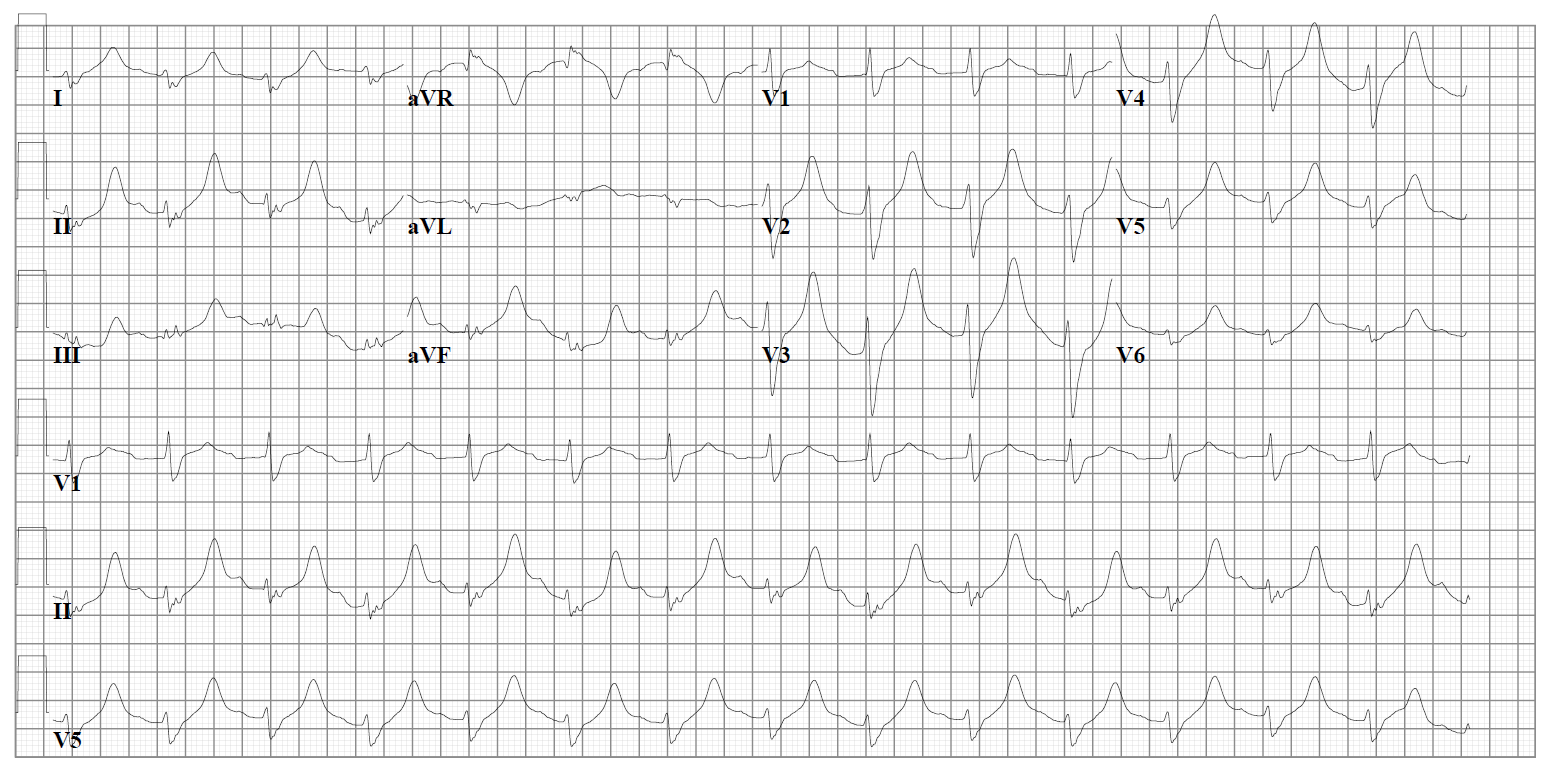 Below is a 12-lead ECG of Torsades de Pointes (TdP) in a 56-year-old white female with a potassium of 2.4 mmol/L and a magnesium of 1.6 mg/dL.