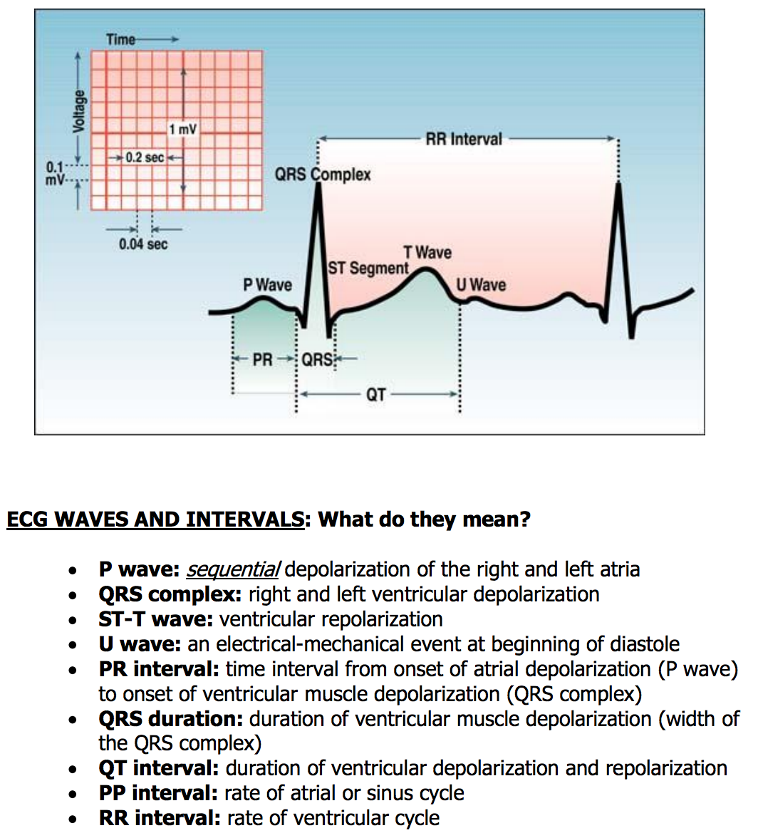 QT interval – represents the time for ventricular depolarization and repolarization to occur (called the QTc interval when corrected for heart rate)